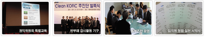 - 기관 청렴수준 향상을 위한 직원 자체조직 활동 강화 클린코픽추진단, 청렴지기, 청렴동아리, 옴부브만기구, 윤리운영위원회, 클린메일, 청탁등록시스템 등 운영 임직원, 부서순환, 부서장, 기관장 청렴교육 실시